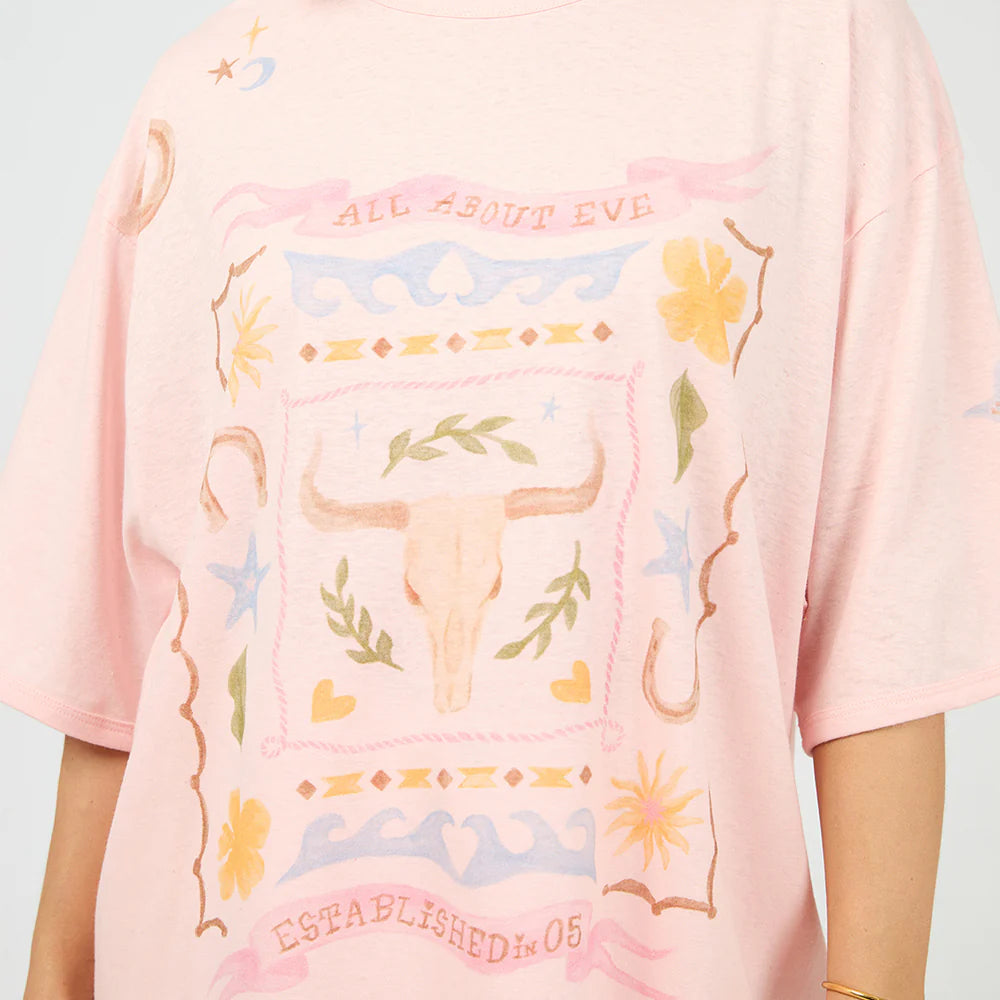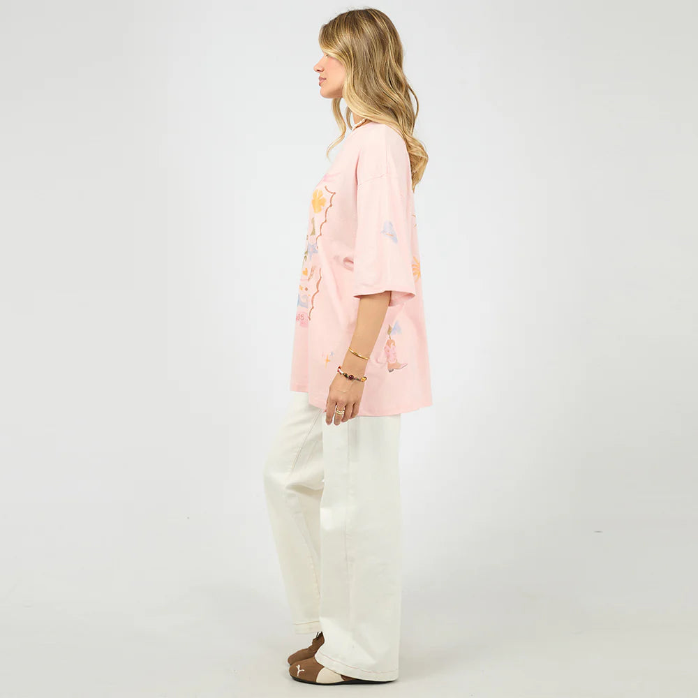 The Aloha Howdy Oversized Tee brings some coastal cowgirl vibes to your everyday with its light pink base and soft hand drawn graphics, finished with playful celestial motifs for a unique design. Its relaxed fit and soft cotton fabric make it a go-to for effortless style. Pair with denim or wide-leg pants for an easy, standout look. Giddy Up!