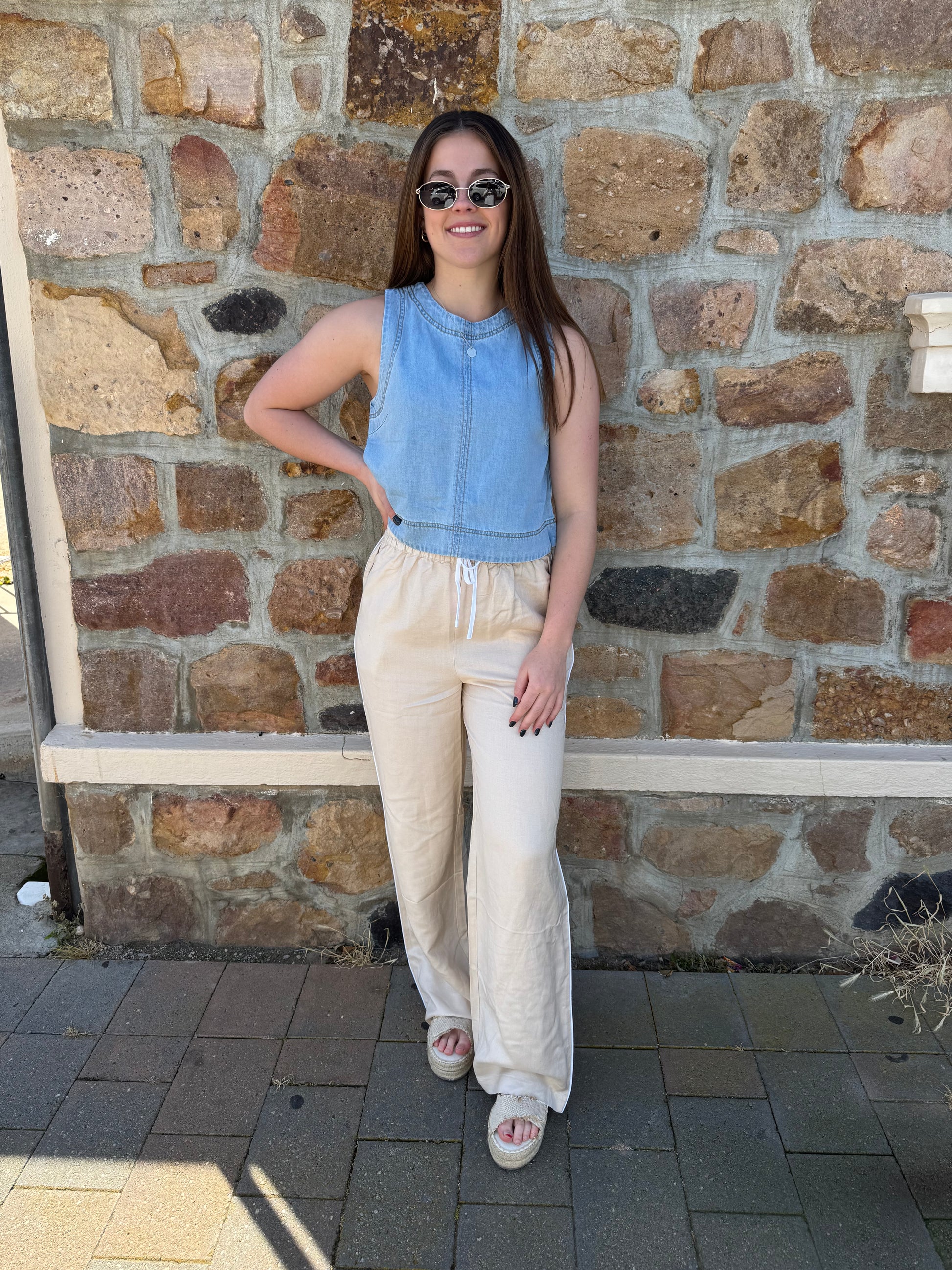 A fresh take on denim dressing. The Amelia Chambray Top is cropped and boxy, with raw-edge detailing and a soft washed blue hue. A subtle keyhole button closure at the back adds a little something extra. Pair it with the matching jeans or layer it over a white tee.
