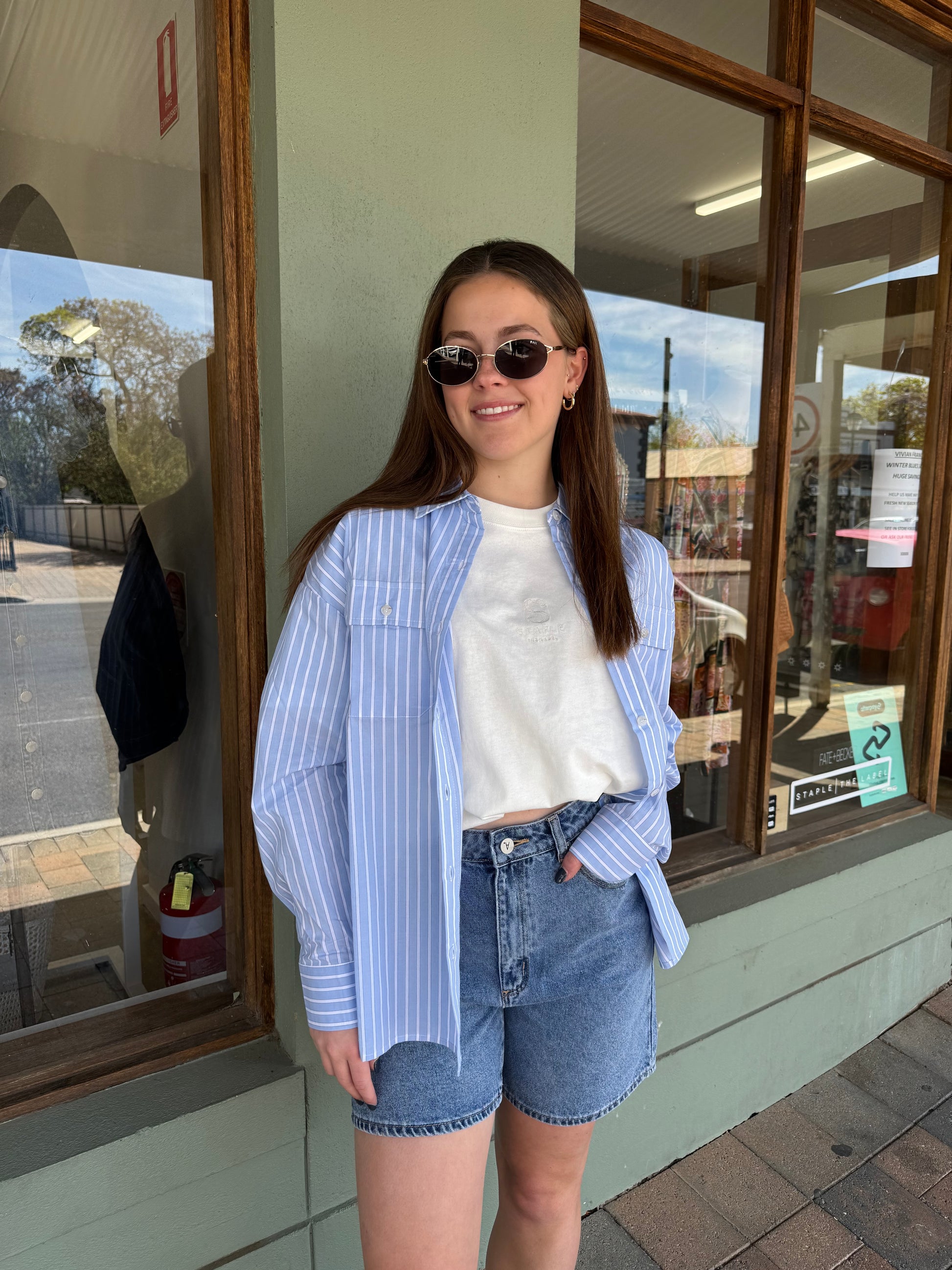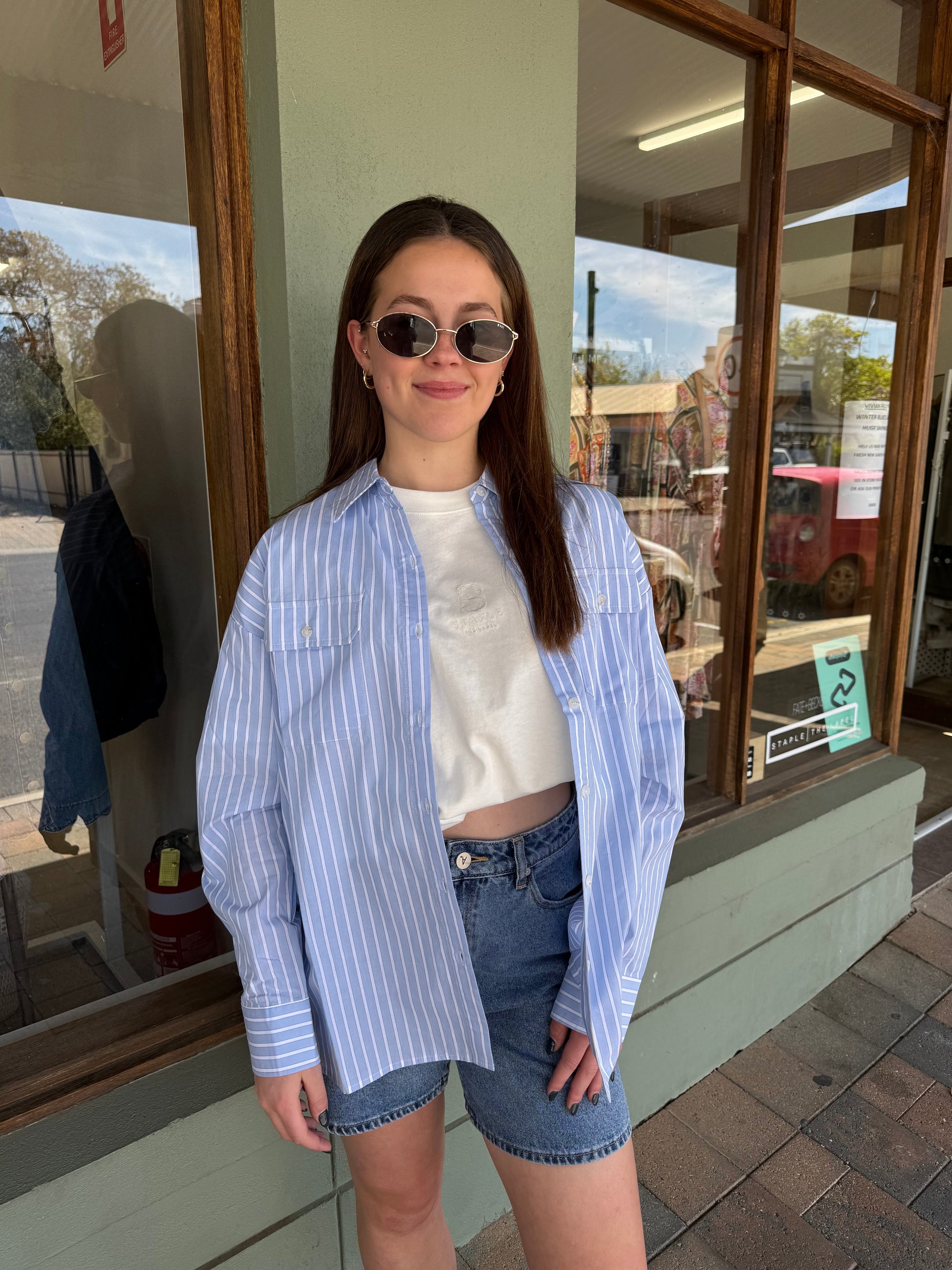 A fresh take on a classic. The Ayra Shirt is cut from crisp 100% cotton in a soft blue stripe and features a relaxed fit with a modern wrap-effect front hem. Chest patch pockets, a button-up front, and tailored cuffs bring just the right amount of structure. Style it tucked, half-tucked, or worn loose - it's the versatile hero your wardrobe needs.