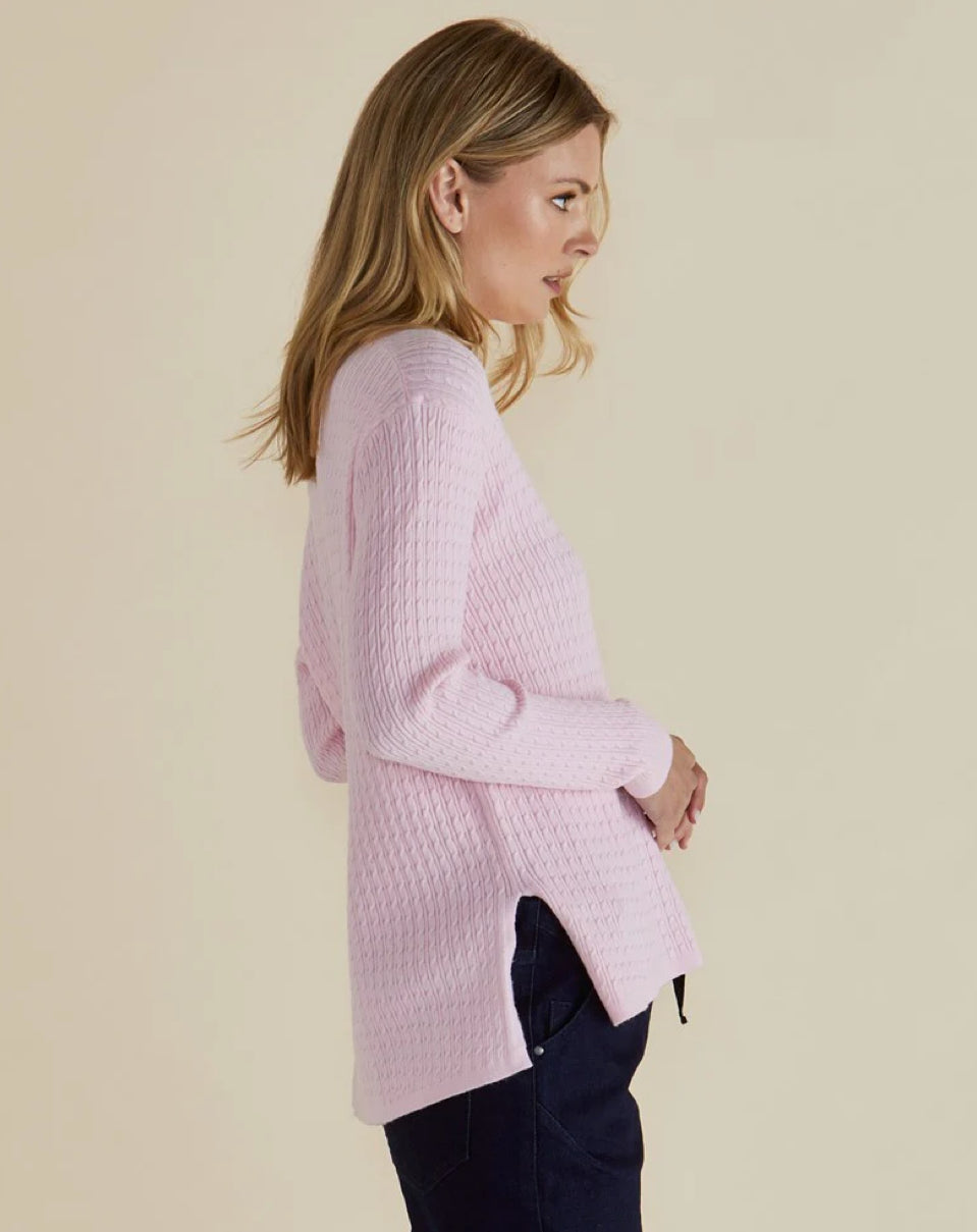 With its soft stretch knit texture and relaxed fit, the Cable Mini Jumper is designed for comfort and effortless style. The high scoop neck and drop shoulder sleeves create a laid-back look, while the high-low hem with side splits adds a contemporary touch. Perfect for layering over your favourite jeans or leggings, this jumper keeps you cozy and chic all day long.