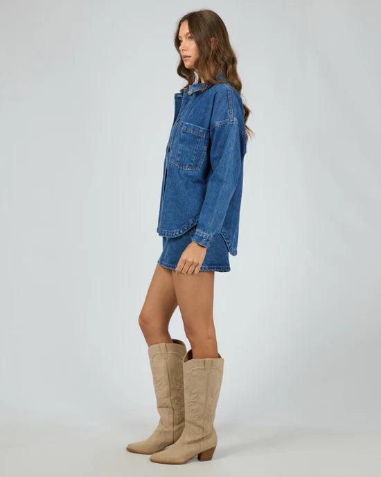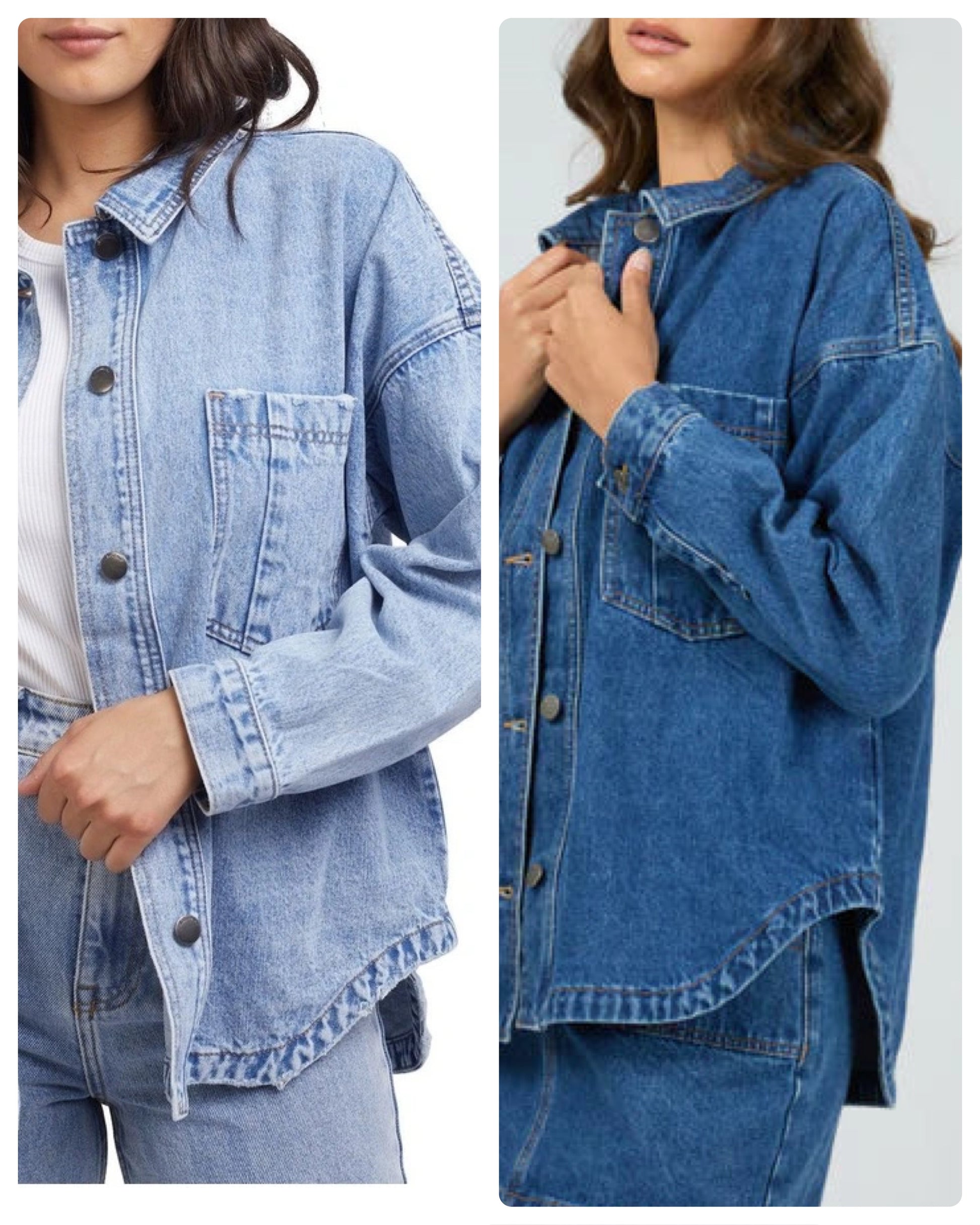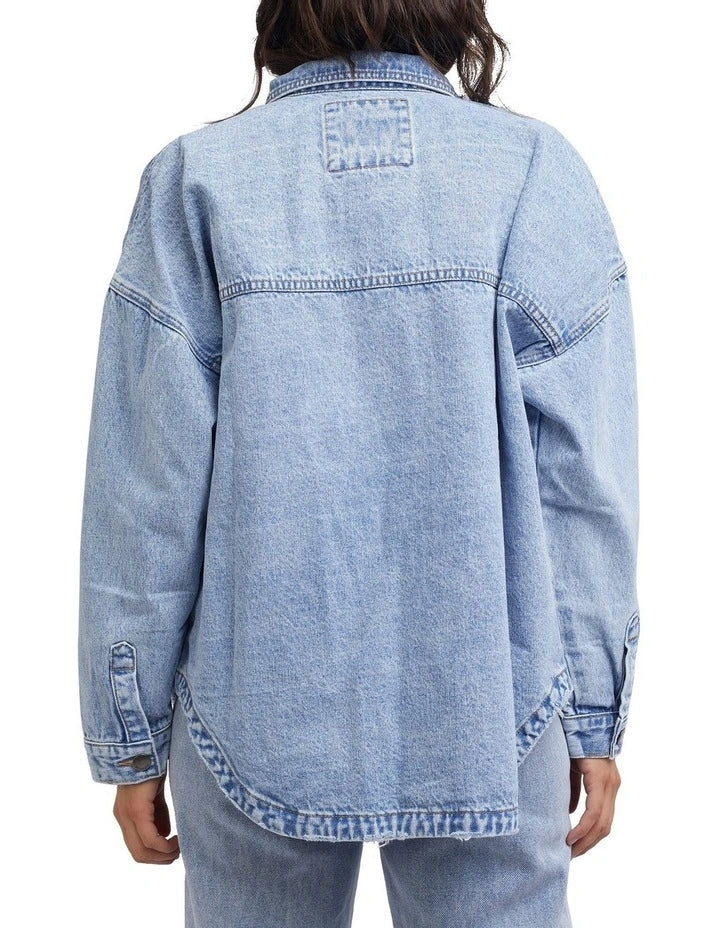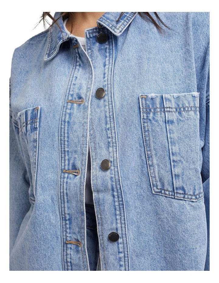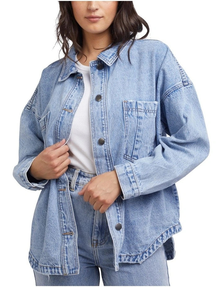 Introducing the Dale Shacket in Heritage Blue by All About Eve. This mid blue denim shacket features a collared neckline and chest pockets, with contrasting tan stitching. Its long sleeves and button-up front make it the perfect blend of shirt and jacket, while its oversized fit adds a touch of comfort. Made with 100% cotton denim fabric, this shacket is true to size and perfect for any occasion.