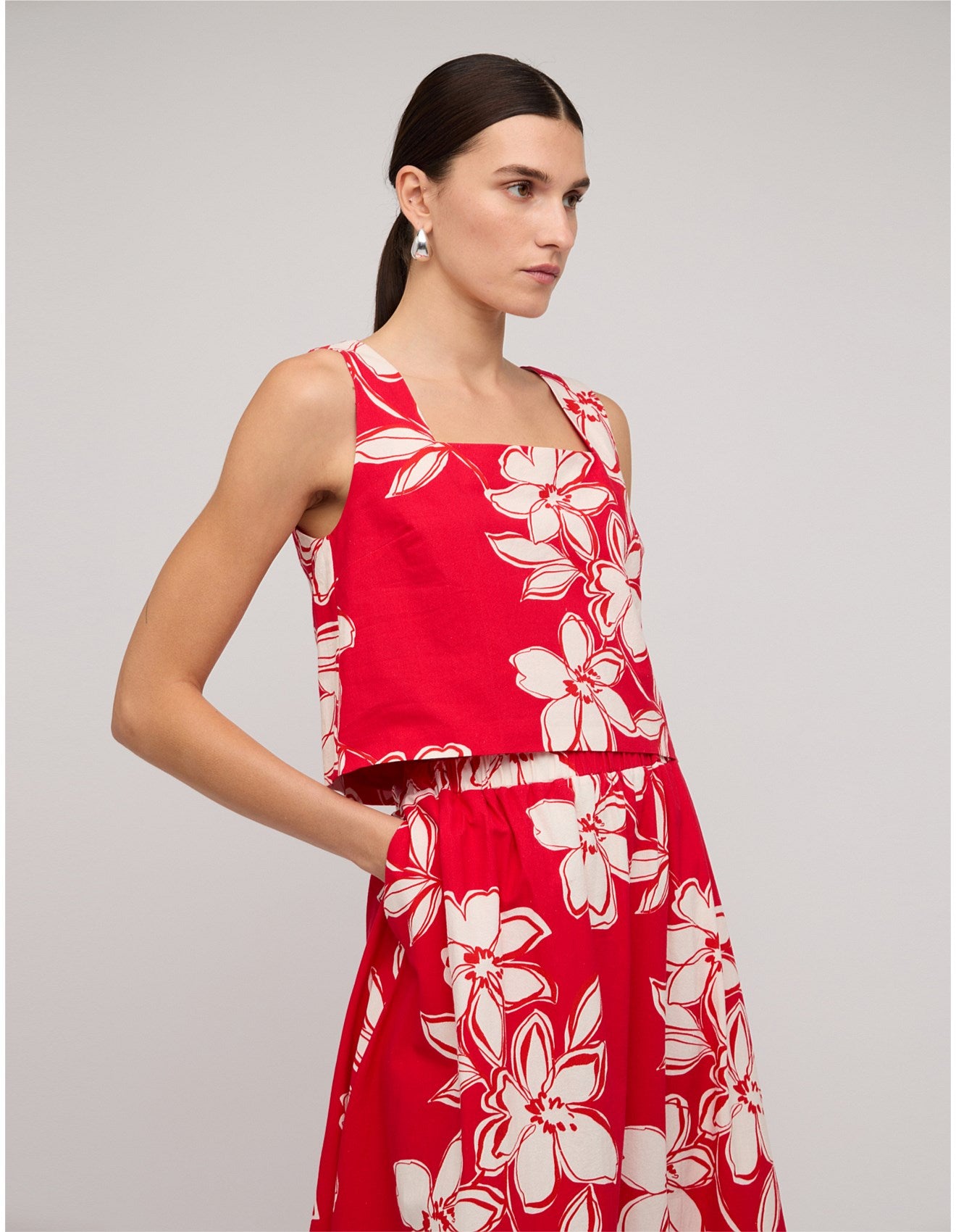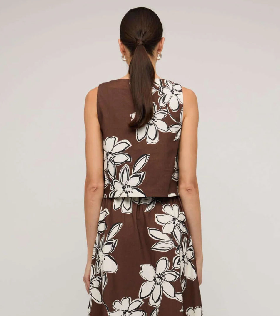 The Elara Brown & White Cotton Floral Crop Top is a fresh, versatile piece in a rich chocolate brown floral print. Crafted from 100% cotton with a breathable viscose lining, it features a square neckline, wide straps, and a relaxed cropped silhouette. Wear it with the matching Elara Maxi Skirt for a coordinated look or style it with denim for easy weekend dressing.