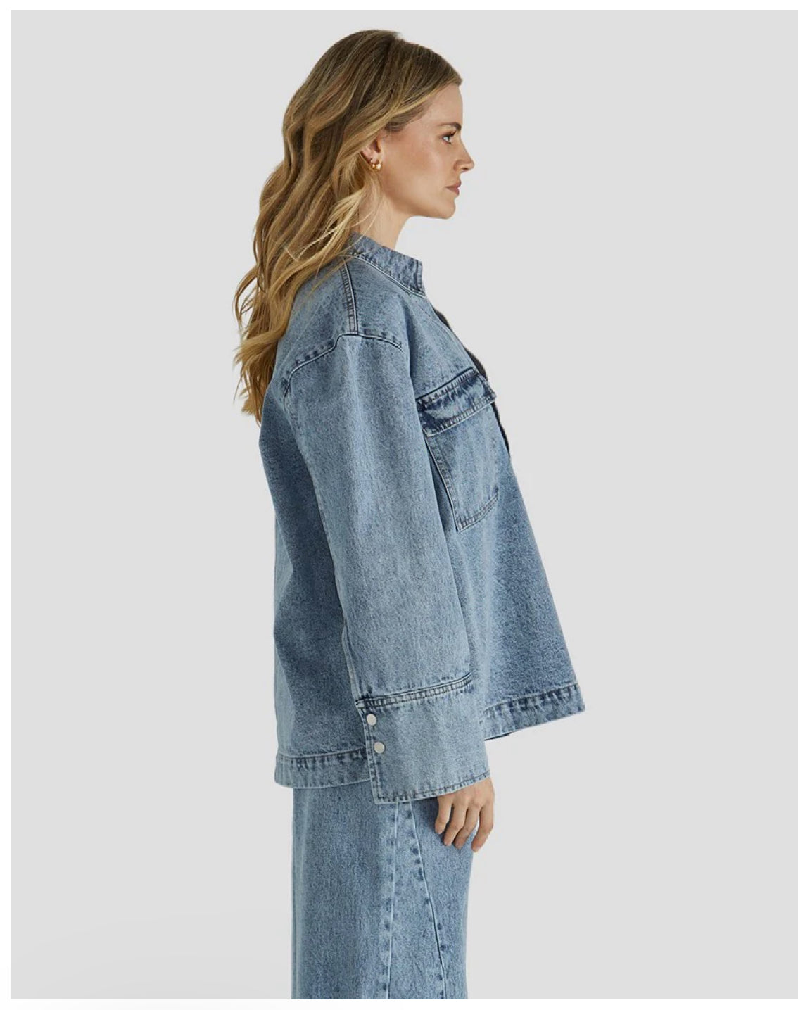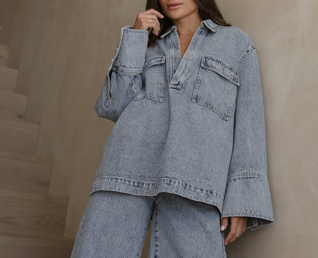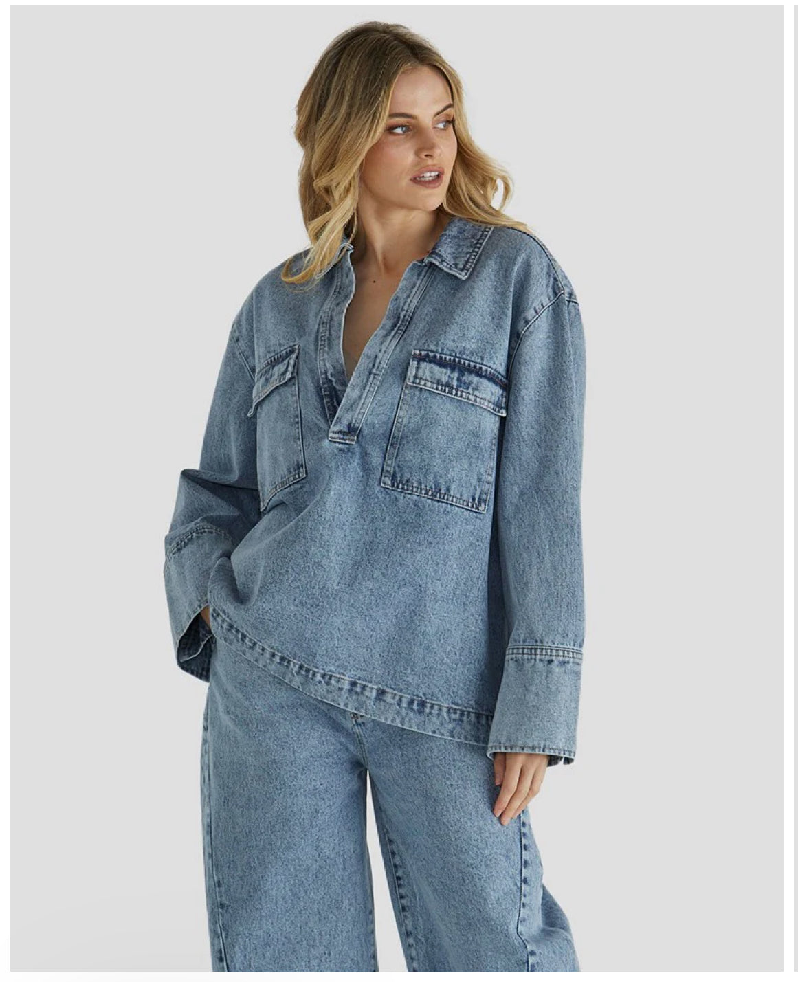 Oversized and on-trend, this acid-wash top brings effortless cool to your wardrobe. Featuring a deep hem band and wide cuffs, it’s got that relaxed, borrowed-from-the-boys feel. Functional chest pockets add an elevated touch, making it perfect for layering or wearing solo. Pair it with the matching Jordon jeans for a head-to-toe denim moment!