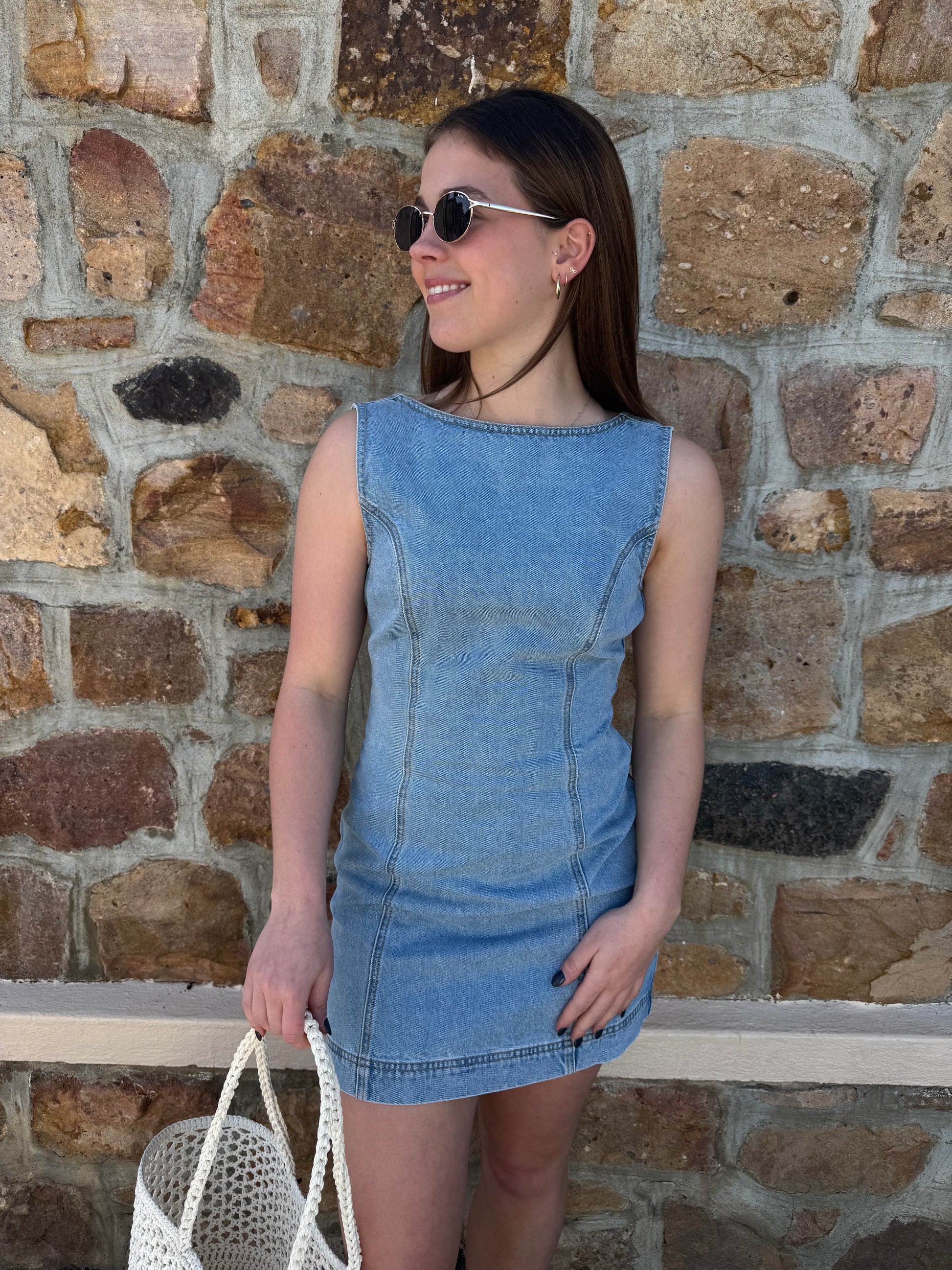 The Miles Blue Denim Scoop Back Mini Dress is a fresh take on a classic, blending clean lines with a flattering fit. Crafted from 100% cotton denim, it features a sleeveless design, crew neckline, and subtle panel seam detailing to contour the shape. The low scoop back with an exposed zip adds a touch of edge, making it perfect for both casual days and dressed-up nights.