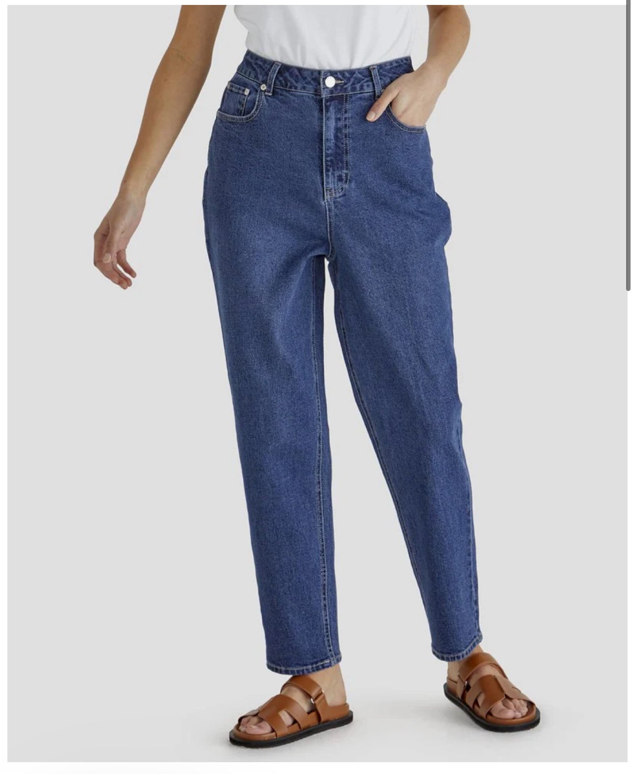 The Olive Jean offers a high-waisted fit and classic five-pocket design for a timeless look. With a zip fly and button closure, these mom-style jeans provide comfort and a flattering fit, perfect for versatile, everyday wear.