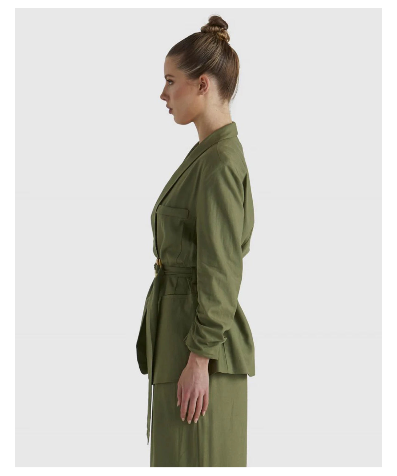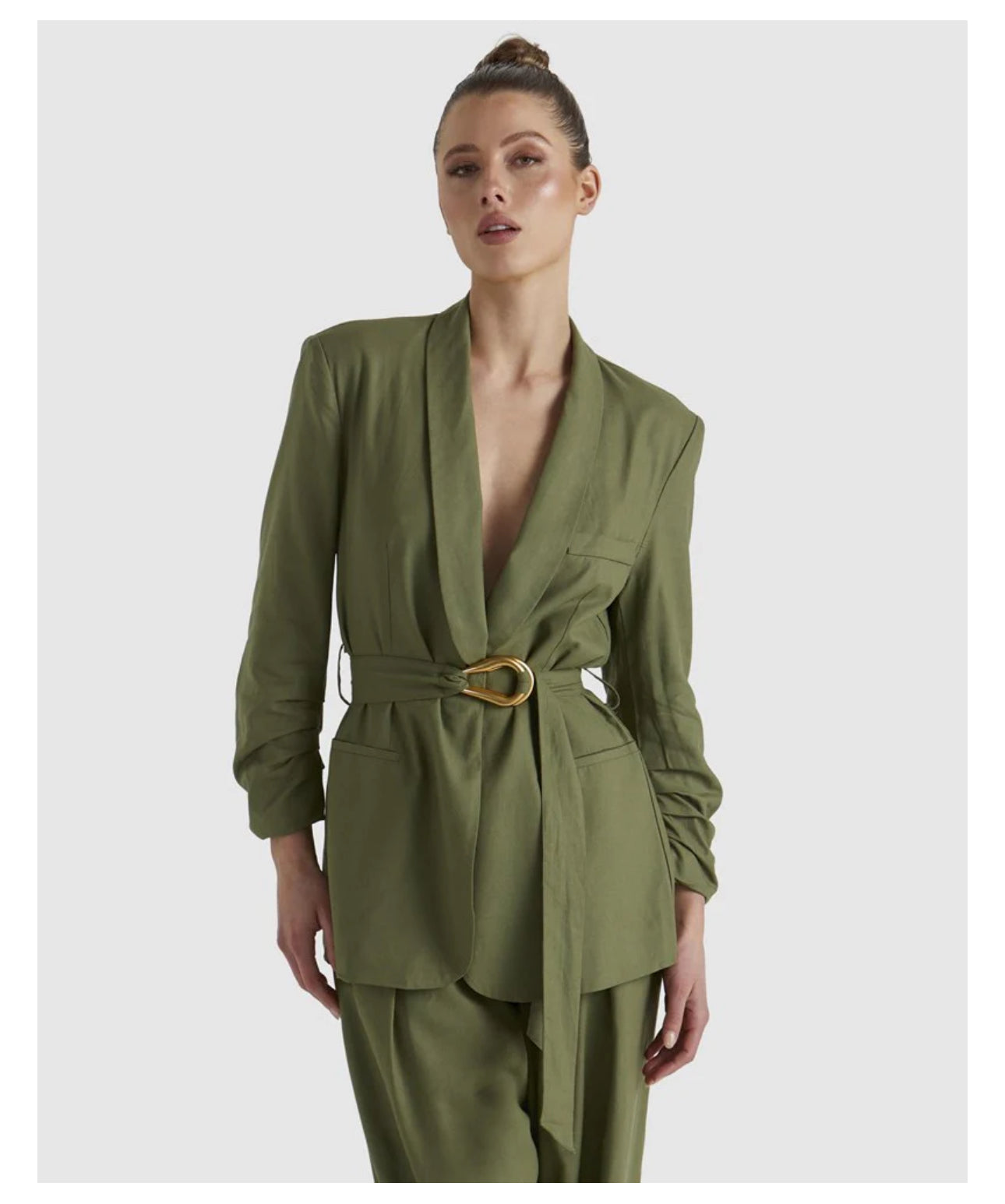 The Shoreline Blazer is a sophisticated outerwear staple, featuring a curved lapel and a self-fabric belt with gold buckle accents. Its refined tailoring and sleek design make it a versatile piece for elevated styling.