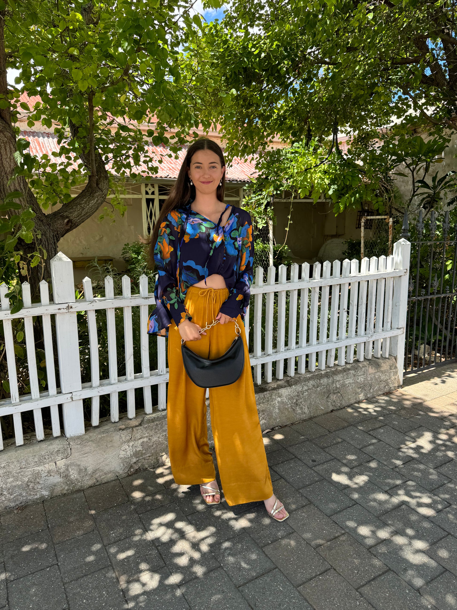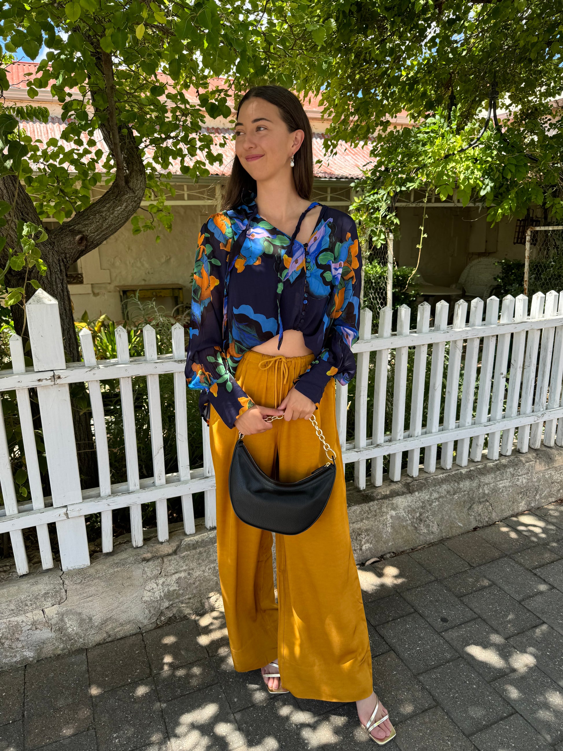 The Twilight Top exudes modern sophistication, with its V-neckline and button-front opening. Long sleeves with wide cuffs add a touch of elegance to this effortlessly elevated design.