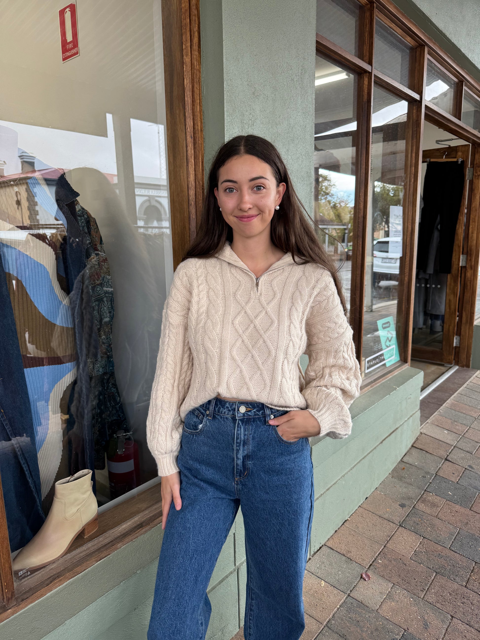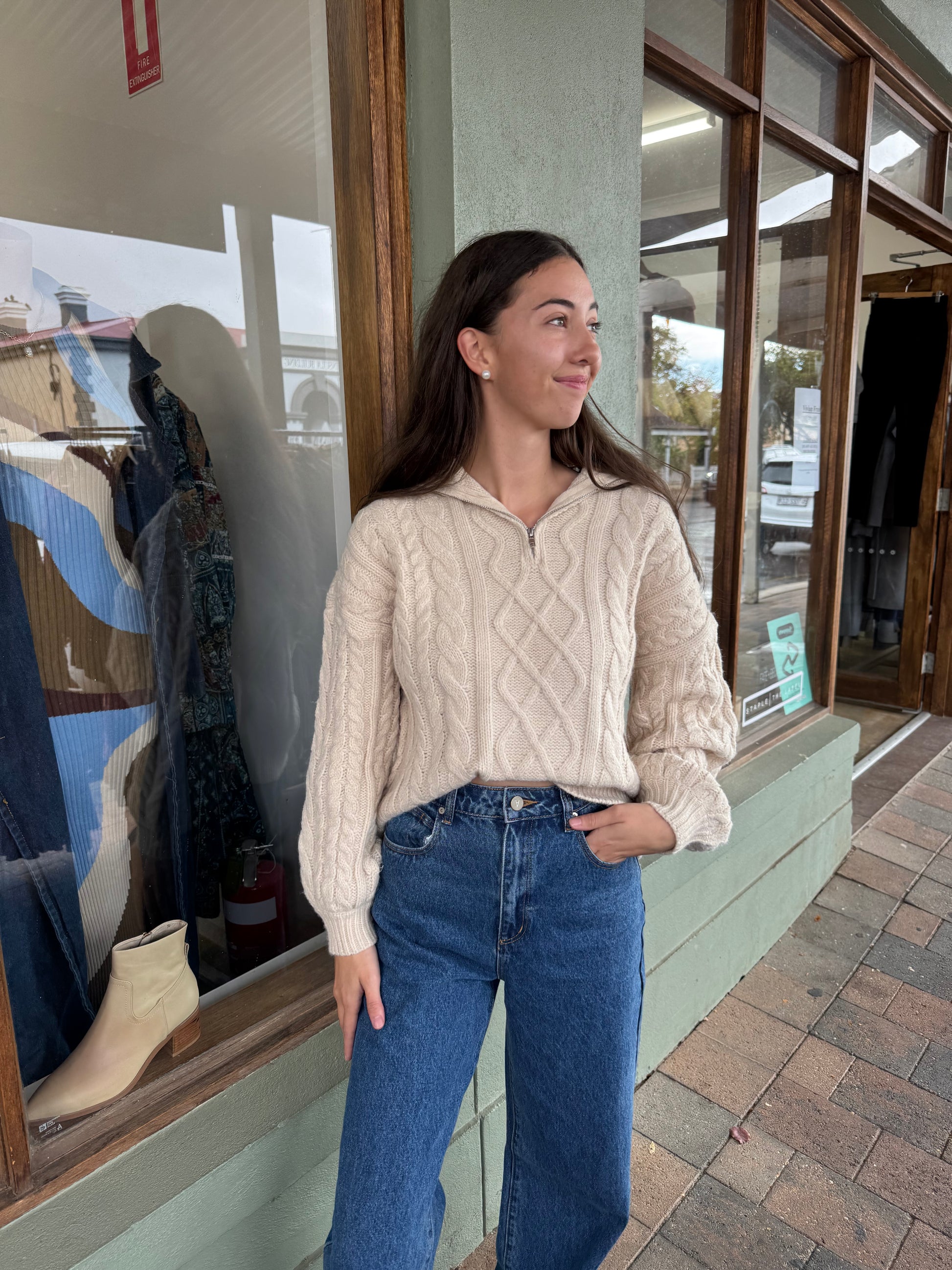 Stay cozy in style, with the new-in Varsity Cable Knit Sweater by MINKPINK. Featuring a relaxed silhouette, and neutral beige wash. Pair yours with the new-in Nadia Denim Patch Pocket Jean to complete the look.