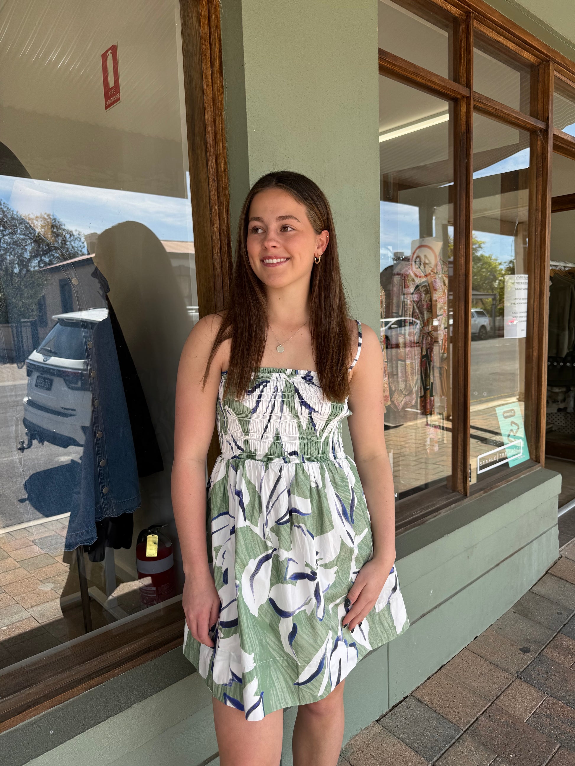 The Veda Green & White Shirred Mini Dress is your go-to for playful, sunshine-ready style. Crafted from a soft 85% Viscose, 15% Linen blend, it features an all-over botanical print in fresh green, violet, and white. The fitted shirred bodice offers comfort and shape, while the flared mini skirt brings a breezy, flattering silhouette. Adjustable spaghetti straps complete the look for a custom fit.