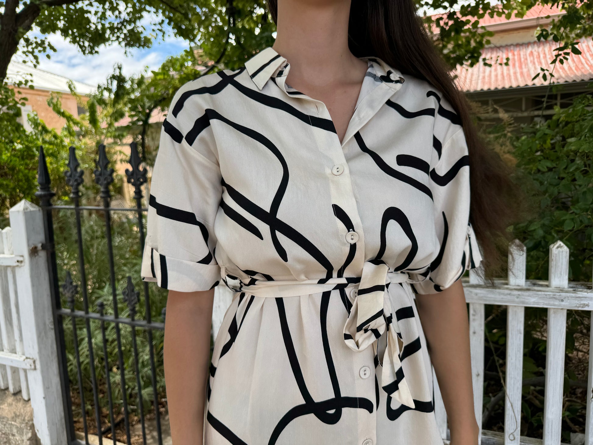 The Zenith Midi Shirtdress features a relaxed silhouette, and a bold abstract pattern. This print is exclusive to Staple the Label. Style with neutral mules or chunky slides to complete the look.